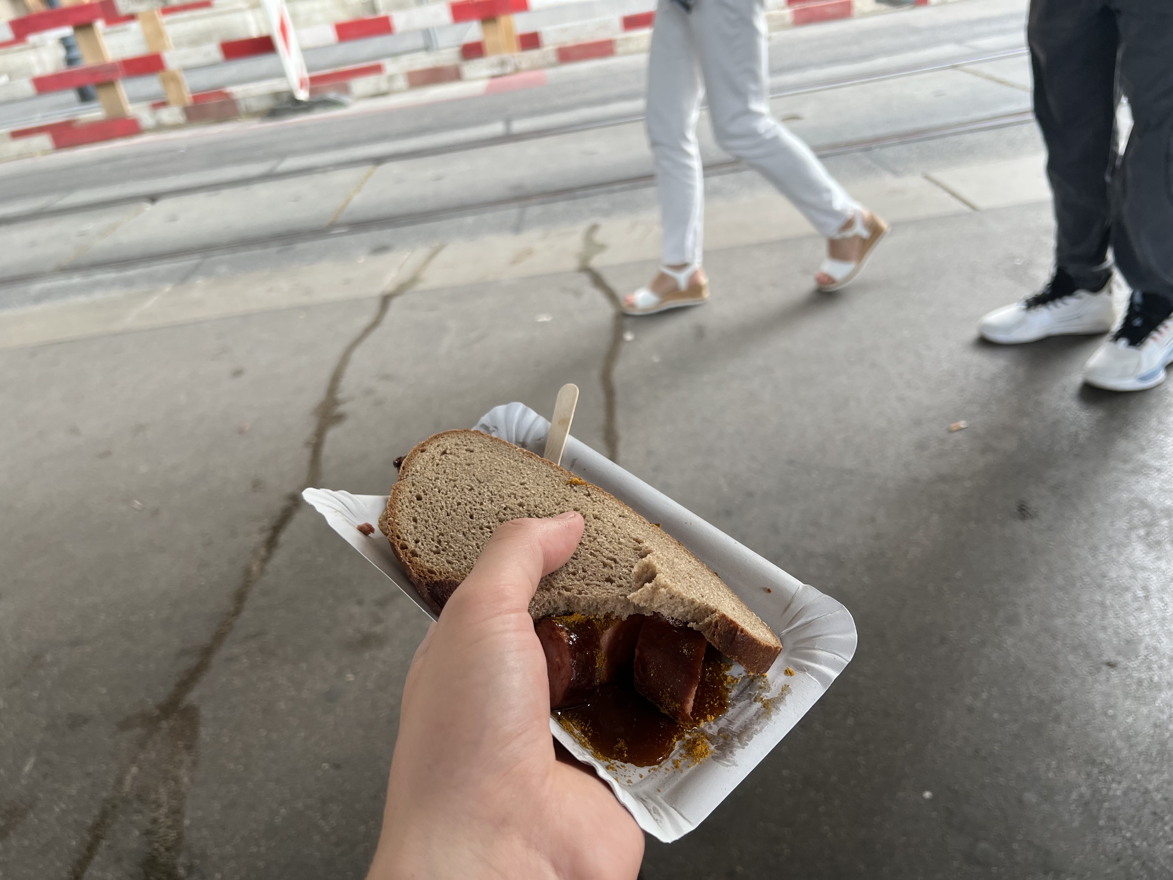 - Tram stop €5 Currywurst (just a sausage, brown bread and sauce)